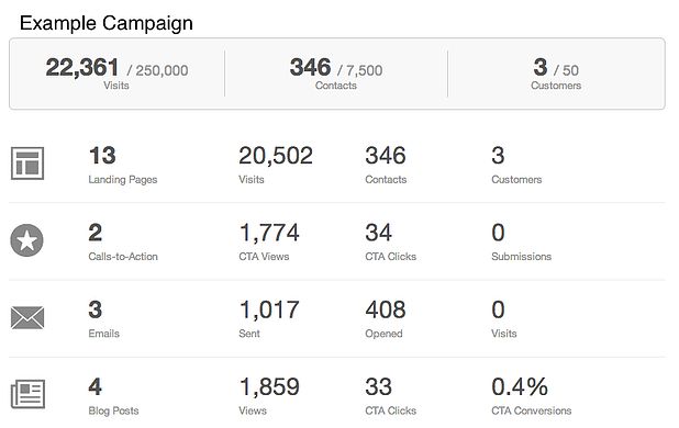 If you're a HubSpot customer, you can organize, execute, and measure your campaigns directly from the Campaign app. This will show you how many visits, contacts, and customers your campaign generated against your goals and how each promotion channel contributed to those outcomes.